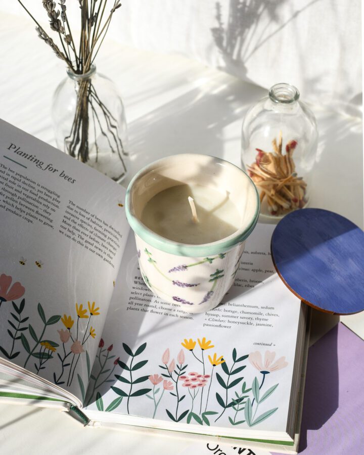 100 % cera de soja. Maceta de cerámica artesanal pintada a mano.